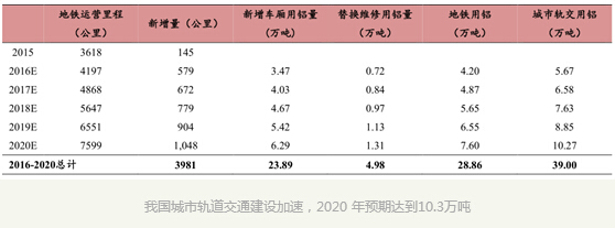 地鐵:地鐵占城市軌道交通比例 74% ,預(yù)期未來五年新建鋁城市軌道交通用鋁 23.9 萬噸,車體大部件折舊替換約用鋁約 5 萬噸 。 根據(jù)以上粗略估計,預(yù)期未來五年城市軌道交通用鋁需求到將達(dá)到39 萬噸,2020年將達(dá)到 10.3 萬噸。